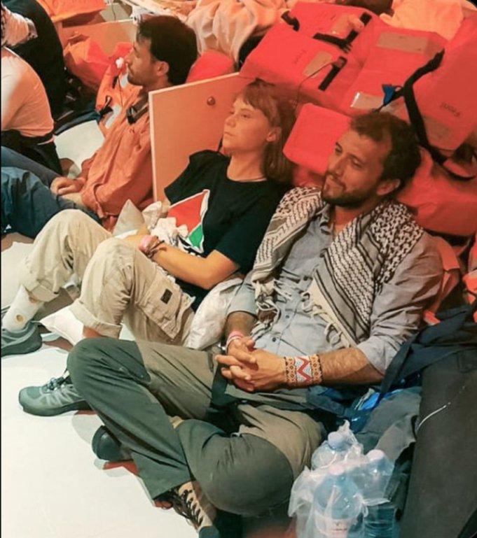 Greta Thunberg duduk di sebelah seseorang yang memiliki perlengkapan taktis ketika armada Sumud global dicegat oleh pasukan keamanan Israel.