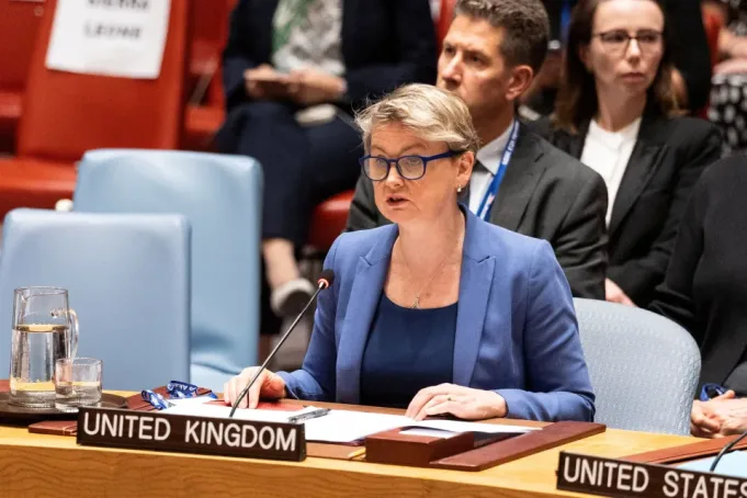 Menteri Luar Negeri Inggris Yvette Cooper berbicara kepada Dewan Keamanan PBB.