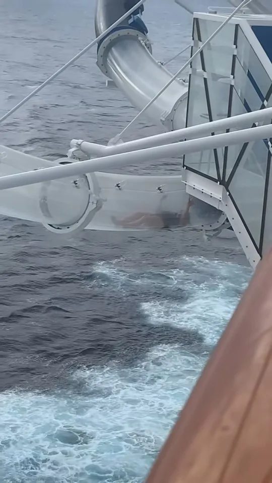 Seorang penumpang kapal pesiar terjebak di seluncuran kapal pesiar tembus pandang sementara tergantung lebih dari 100 kaki di atas laut selama Badai Erin.