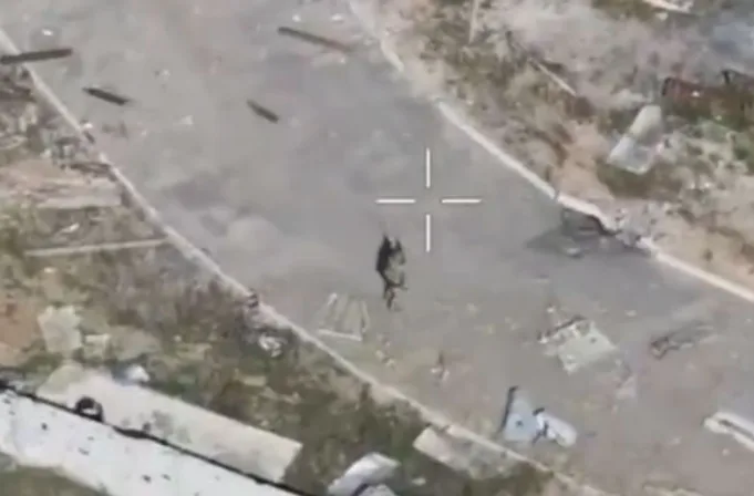 Video yang tidak diverifikasi dari drone yang menunjukkan seorang prajurit yang tidak diverifikasi dari Brigade Respons Rapid ke -7 dari Pasukan Serangan Udara, dengan pembacaan digital di layar.