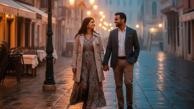 Buat momen tepi laut yang romantis di mana pasangan berjalan tanpa alas kaki di sepanjang pantai dan mengumpulkan kerang. Ombaknya dengan lembut mencium kaki mereka saat matahari lebih rendah di cakrawala. Bayangan panjang dan cahaya berkilauan mereka harus ada.