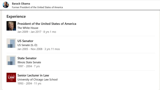 Akibatnya, wajah pemimpin MAGA sekarang muncul di bagian pengalaman dari setiap pengguna LinkedIn yang memiliki Gedung Putih yang terdaftar di resume digital mereka, termasuk saingan politiknya yang lama demokratis, Barack Obama.