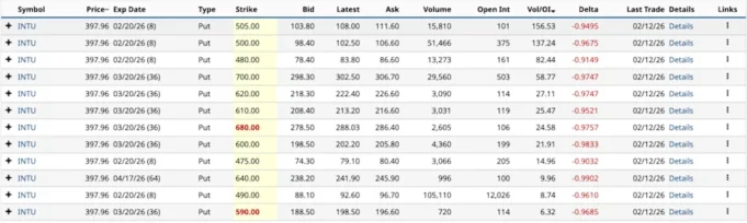 Halaman Alur Opsi Barchart kemarin menunjukkan opsi Intuit memiliki sentimen perdagangan bersih hampir $ 675 juta. Itu sangat bullish. Puting 20 Februari memiliki 21 perdagangan dengan volume 1 000 atau lebih tinggi; tujuh lebih dari 10 000