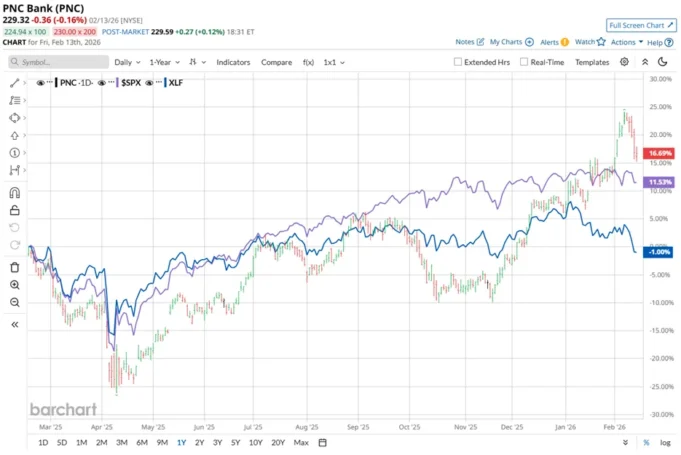 Pada 16 Januari, saham melonjak 3,8% intraday setelah PNC Financial melaporkan hasil fiskal Q4 2025 yang melebihi ekspektasi analis. Pendapatan melonjak 9,1% dari tahun ke tahun menjadi $6,07 miliar, melampaui proyeksi Street sebesar $5,97 miliar, sementara EPS melonjak 29,4% menjadi $4,88 dari tahun lalu, melampaui perkiraan analis sebesar $4,21.