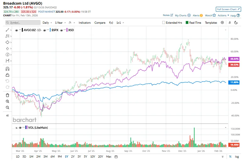 AVGO telah naik 37, 9 % selama setahun terakhir, mengungguli kenaikan Indeks S&P 500 ($SPX) sebesar 11, 8 %. Pada tahun 2026, saham AVGO naik 5, 2 %, melampaui penurunan marjinal SPX secara YTD.