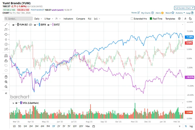 Mempersempit fokus, YUM telah mengungguli AdvisorShares Restaurant ETF (EATZ), yang telah turun 11 % selama setahun terakhir dan naik 3, 9 % secara YTD.