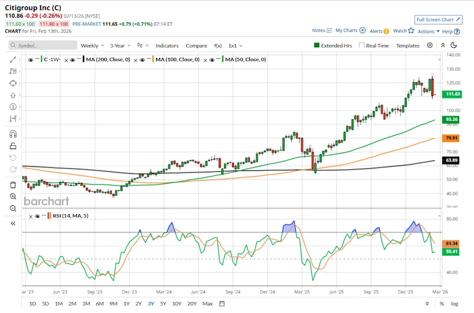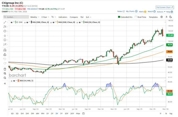 Meskipun saham-saham teknologi terkena dampak terbesar dari aksi jual pasar baru-baru ini, sektor-sektor lain juga merasakan dampaknya, sehingga membuka peluang pembelian. Secara khusus, Citigroup (C)—yang memperoleh kenaikan sebesar 66% pada tahun lalu dan mengungguli sebagian besar perusahaan perbankan berkapitalisasi besar di AS—turun lebih dari 11% dari nilai tertingginya pada tahun 2026. Dalam artikel saya sebelumnya, saya telah mencatat bahwa valuasi Citi tidak banyak berpengaruh karena imbalan risikonya cukup seimbang. Di sini kita akan membahas apakah saham telah memasuki zona beli setelah koreksi baru-baru ini.