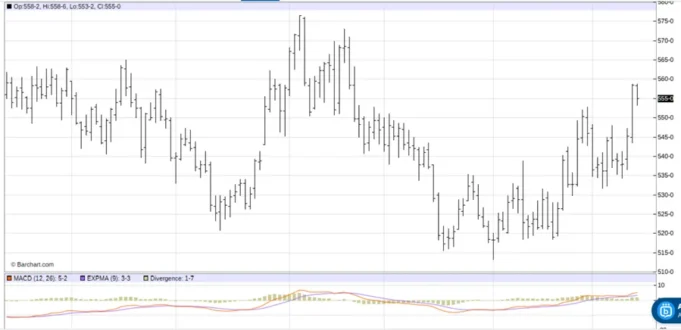 Lihat pada grafik batang harian untuk gandum SRW berjangka bulan Mei bahwa harga cenderung lebih tinggi dan pada hari Kamis mencapai level tertinggi dalam hampir tiga bulan. Lihat juga di bagian bawah grafik bahwa indikator moving average konvergensi divergensi (MACD) juga berada dalam posisi bullish, karena garis MACD biru berada di atas garis pemicu merah dan kedua garis tersebut cenderung lebih tinggi.