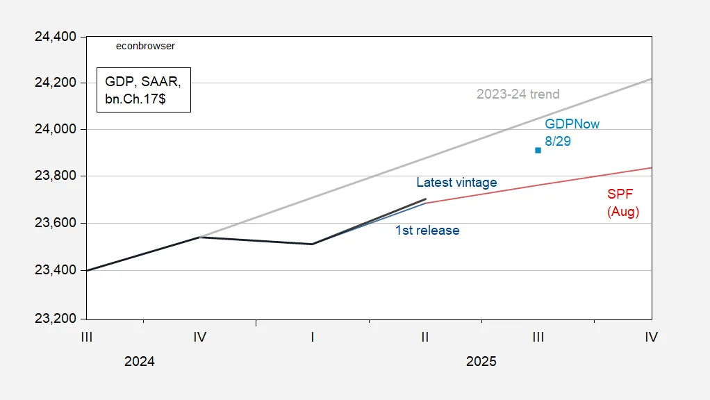 Gambar 1: PDB, vintage terbaru (Strong Black), Rilis Advancement (Biru), GDPnow 8/ 29 (Light Blue Square), Survei Peramal Profesional August Average (Dark Red), 2023 – 24 Tren Stochastic (Gray), semuanya di BN.CH. 2017 $ Saar. Sumber: BEA, Atlanta Fed, Philly Fed, dan perhitungan penulis.
