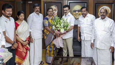 Centimeters Tamil Nadu MK Stalin, wakil negara centimeters Udhayanidhi Stalin, MP DMK Kanimozhi Karunanidhi, Sekretaris Jenderal DMDK Premalatha Vijayakanth dan lainnya dalam pertemuan, di markas DMK di Chennai pada hari Kamis. (PTI)