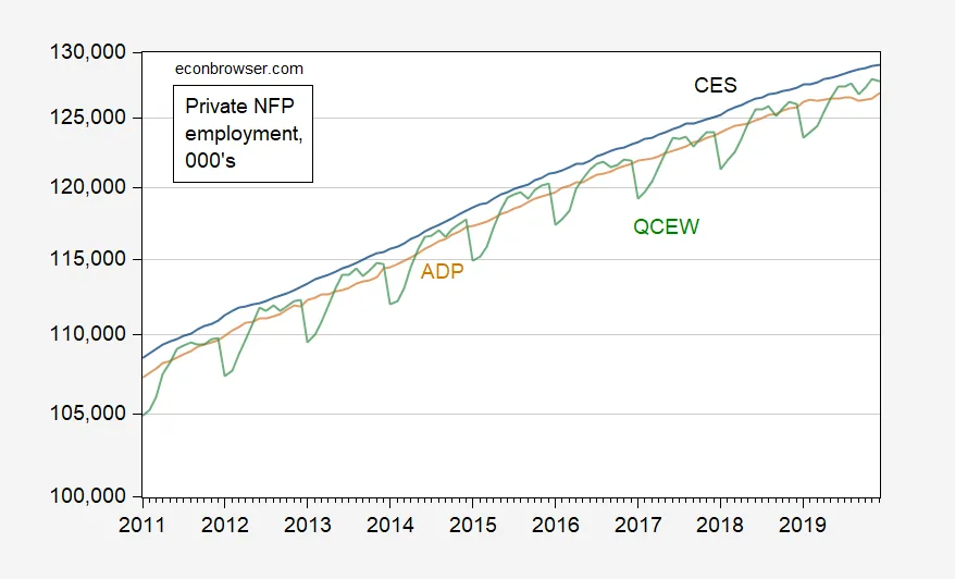 Gambar 1: Pekerjaan penggajian non -pertanian swasta dari CES, SA (biru), dari ADP, SA (TAN), dan tercakup Pekerjaan Payroll Nonpertan Privat dari QCEW, NSA (Green), di 000 -an. Sumber: BLS, ADP using Fred, BLS.