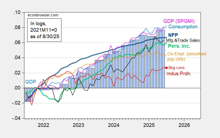Gambar 1: Nonfarm Payroll from CES (strong blue), civilian employment with smoothed population controls (orange), industrial production (red), Bloomberg consensus commercial manufacturing of 8/ 14, (red square), personal revenue omitting present transfers in Ch. 2017 $ (bold light eco-friendly), manufacturing and profession sales in Ch. 2017 $ (black), consumption in Ch. 2017 $ (light blue), and monthly GDP in Ch. 2017 $ (merah muda), PDB (bilah biru), semua log dinormalisasi ke 2021 m 11 = 0. Sumber: BLS Via Fred, Federal Get, BEA 2025 Q 2 Rilis Kedua, S&P Global Market Insights (Nee Macroeconomic Advisers, IHS Markit) (8/ 1/ Rilis 2025, dan perhitungan penulis.