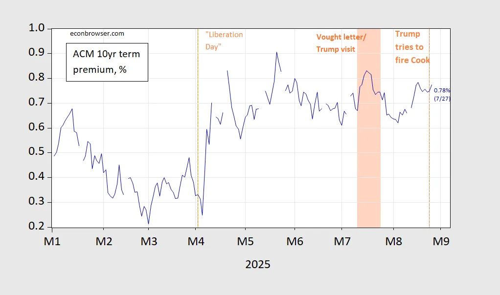 Gambar 1: Premium istilah sepuluh tahun, dalam % (biru). Naungan oranye ringan menunjukkan periode antara surat Vought untuk kunjungan Powell dan Trump ke Fed. Sumber: The Fed