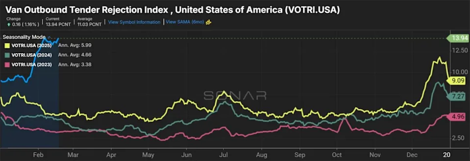 Penolakan tender dan harga spot mulai bergerak lebih tinggi pada minggu sebelum Thanksgiving dan belum mengalami penurunan musiman seperti yang terjadi sepanjang tahun ini. Delco mengatakan sebagian besar pelanggan JB Search (NASDAQ: JBHT) masih mengatakan bahwa perubahan tersebut tidak bersifat struktural dan bahwa badai musim dingin di bulan Desember dan Januari berada di balik pergeseran pasar.