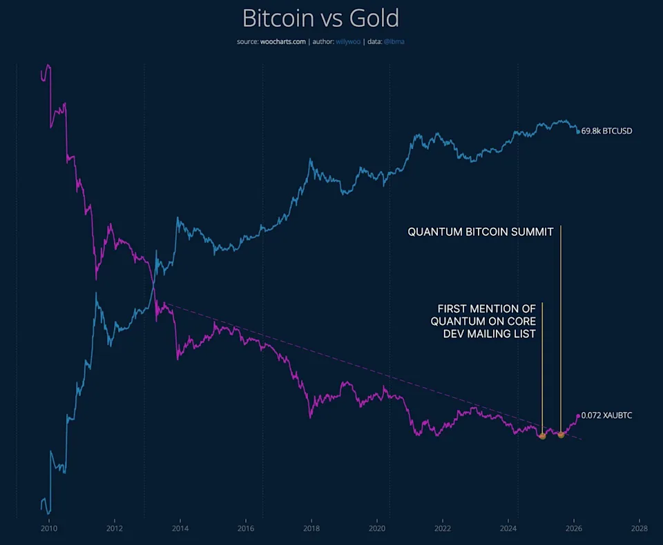 Risiko komputasi kuantum membebani penilaian relatif Bitcoin (BTC) terhadap emas, menurut analis Willy Woo.