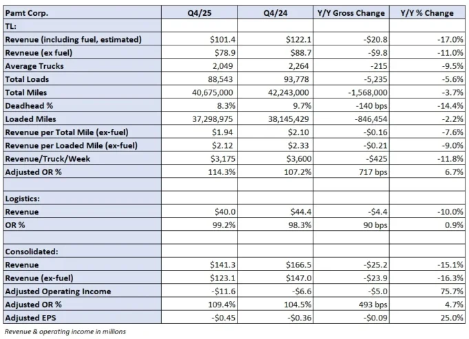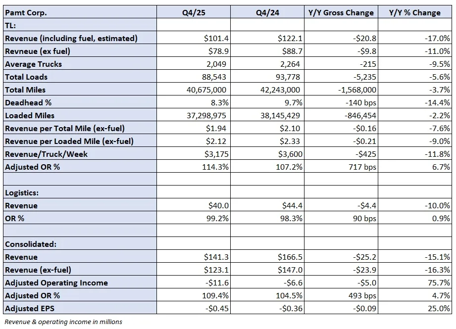 Pengangkut truk Pamt Corp. melaporkan kerugian bersih untuk kuartal keempat sebelum pasar ditutup pada hari Jumat. Ini merupakan kerugian kuartalan kelima berturut-turut yang dialami maskapai penerbangan yang berbasis di Arkansas tersebut.