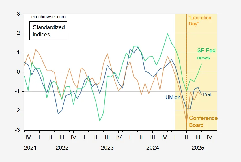 Gambar 1: U. Michigan Customer Sentiment (Fred Series UMCSENT) (Biru), Conference Board Confidence (TAN), SF Fed News Belief Index (Eco-friendly), semua distandarisasi untuk periode 2021 m 01 – 2025 m 02 Sentimen Juli adalah pendahuluan; Sentimen Berita Agustus hingga 24 Agustus. U.Michigan through Fred, Dewan Konferensi, SF Fed, NBER dan perhitungan penulis.