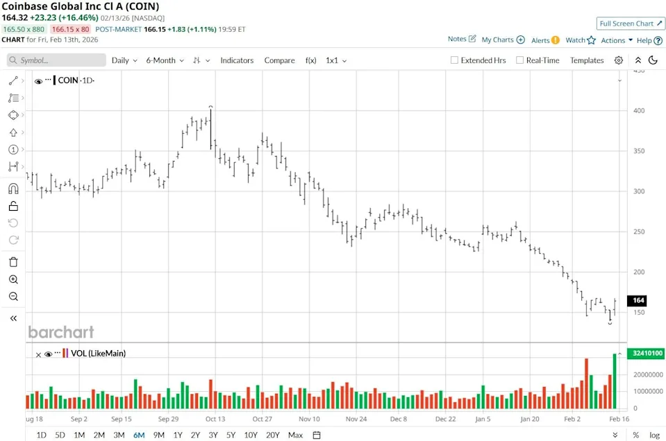 Saham Coinbase (COIN) menguat sebanyak 20% seiring dengan pemulihan tajam Bitcoin (BTCUSD) pada 13 Februari, membalikkan sebagian besar kerugian mereka dari pendapatan mengecewakan di awal minggu.
