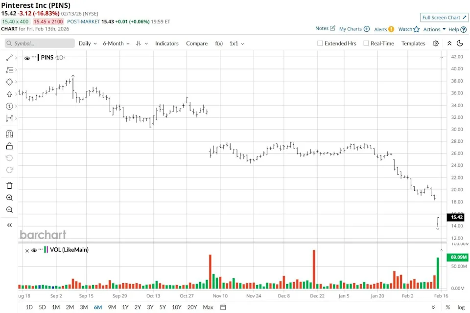 Saham Pinterest (PINS) ditutup lebih rendah lebih dari 16% pada Jumat lalu setelah perusahaan penemuan visual tersebut melaporkan Q4 yang lebih lemah dari perkiraan dan mengeluarkan panduan yang mengecewakan untuk masa depan.