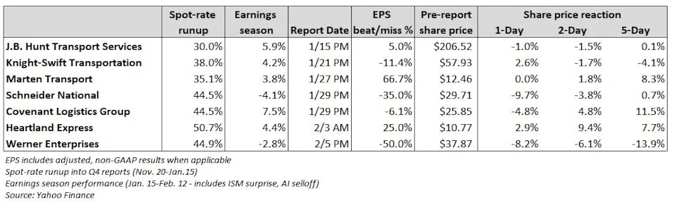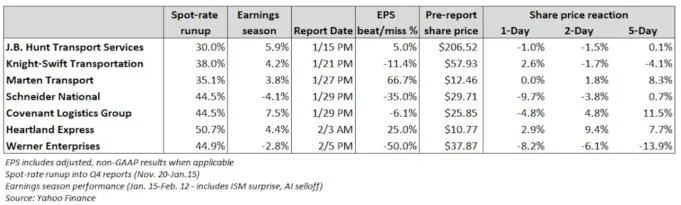Saham-saham bermuatan truk tampak dihargai dengan sempurna menjelang musim pendapatan kuartal keempat. Saham melonjak lebih dari 40 % lebih tinggi dari minggu sebelum Thanksgiving hingga pertengahan Januari, ketika JB Hunt Transportation Solutions melaporkan. Langkah ini sejalan dengan meningkatnya penolakan tender dan harga place. Pendapatan yang meleset dan prospek yang lesu akan dihukum sampai pembaruan manufaktur yang secara mengejutkan positif memberikan kesempatan lain bagi kelompok tersebut. Namun, hambatan tersebut sebagian digagalkan oleh sebuah perusahaan teknologi kecil yang menggembar-gemborkan rencana untuk memisahkan ruang tersebut.
