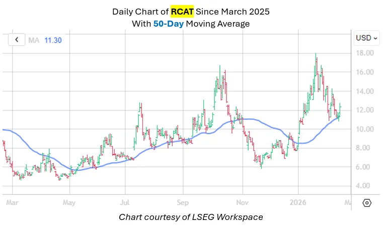 Nama luar angkasa Kucing Merah Holdings Inc (NASDAQ:RCAT) saham telah mundur tajam dari rekor puncaknya pada 22 Januari sebesar $18,02, turun hampir 8% di bulan Februari saja. Namun, keuntungan yang lebih besar mungkin akan terjadi, karena investor tetap tertarik pada proyek-proyek strategis militer ekuitas dan saham-saham yang berada di dekat garis tren bullish secara historis.