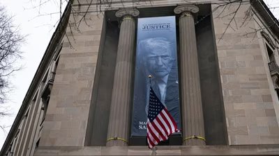 Sebuah spanduk besar yang menampilkan wajah Presiden AS Donald Trump digantung di luar markas besar Departemen Kehakiman di Washington, DC, pada hari Kamis untuk menunjukkan kekuasaan atas lembaga penegak hukum yang pernah menyelidikinya.