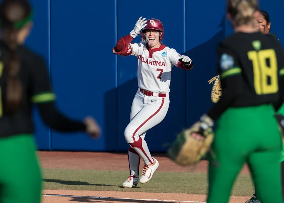 1 Juni 2025; Kota Oklahoma, OK, AS; Pemain luar Oklahoma Sooners Kasidi Pickering (7) menjulurkan lidahnya setelah melakukan lemparan ke posisi pertama pada inning kedua melawan Oregon Ducks selama NCAA Softball Women’s College World Series di Devon Park. Kredit Wajib: Gambar Brett Rojo-Imagne