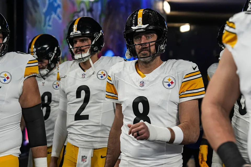 Quarterback Pittsburgh Steelers Aaron Rodgers (8 memasuki lapangan untuk pemanasan di Ford Area di Detroit pada Minggu, 21 Desember 2025