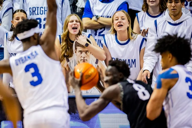 Penggemar BYU Cougars bersorak saat pertandingan melawan Colorado Buffaloes di Marriott Center di Provo pada Sabtu, 14 Februari 2026. | Tess Crowley, Berita Deseret