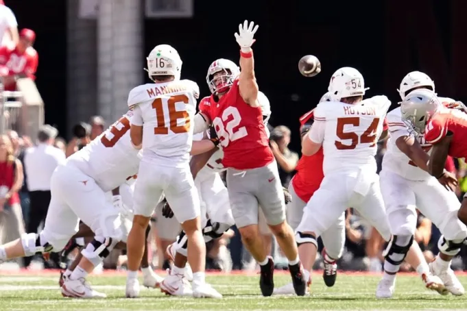 Sindikasi: Pengiriman Columbus Ohio State Buckeyes End Defensive Caden Curry (92 menekan quarterback Texas Longhorns Arc Manning (16 selama paruh kedua pertandingan sepak bola NCAA di Stadion Ohio pada 30 Agustus 2025 Ohio State menang 14 – 7