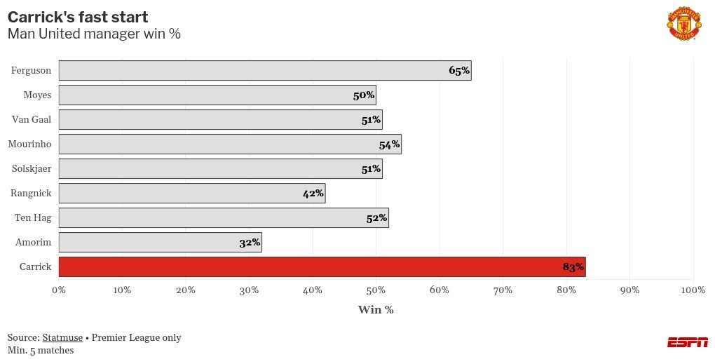 Carrick menindaklanjuti kemenangan melawan Manchester City, Arsenal dan Fulham dengan kemenangan 2-0 melawan mantan klubnya Spurs pada jam makan siang hari Sabtu, ketika Bryan Mbeumo Dan Bruno Fernandes menyelesaikan kemenangan yang layak melawan 10 orang pengunjung di Old Trafford.