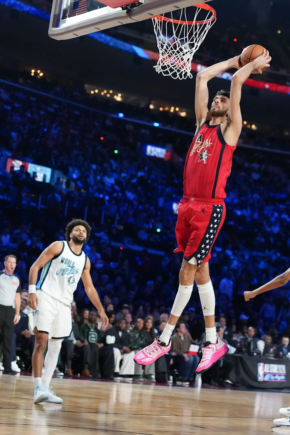 Bintang seperti Minnesota Anthony Edwards dan Detroit Cade Cunningham biasanya berada di ujung lain lapangan. Sisi yang merupakan wilayah musuh. Tapi kali ini mereka berada tepat di sampingnya, membiarkannya terbang dan melakukan beberapa peregangan sebelum pertandingan.