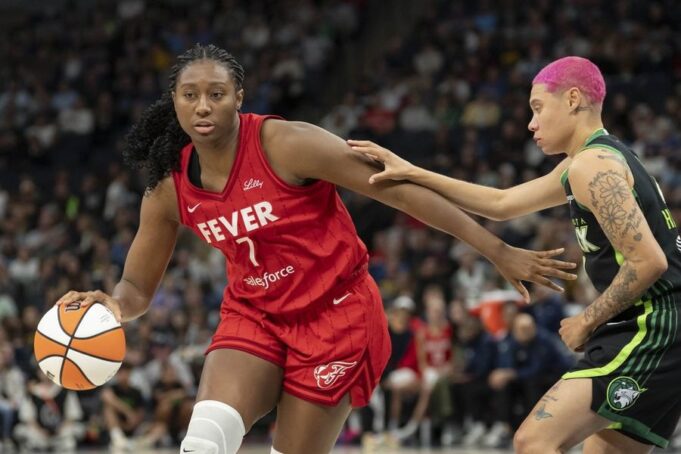 WNBA: Demam Indiana di Minnesota Lynx 24 Agustus 2025; Minneapolis, Minnesota, AS; Penyerang Demam Indiana Aliyah Boston (7 berkendara ke keranjang melewati penjaga Minnesota Lynx Natisha Hiedeman (2 di babak kedua di Target Center. Kredit Wajib: Jesse Johnson-Imagn Images