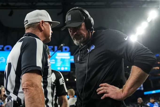 Pelatih kepala Detroit Lions Dan Campbell berbicara dengan wasit Carl Cheffers setelah kalah 29 – 24 dari Pittsburgh Steelers di Ford Area di Detroit pada Minggu, 21 Desember 2025