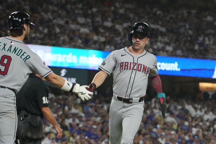 29 Agustus 2025; Los Angeles, The Golden State, AS; Arizona Diamondbacks Fielder kanan Corbin Carroll (7 diberi selamat oleh baseman kedua Blaze Alexander (9 setelah mencetak gol di inning keenam melawan Los Angeles Dodgers di Stadion Dodger. Kredit Wajib: Gambar Kirby Lee-Imagn