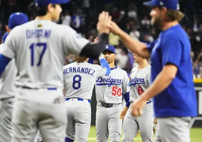 Sindikasi: Republik ArizonaLos Angeles Dodgers Shortstop Mookie Betts (50) Baseman Pertama Fives Enrique Hernandez (8) setelah mengalahkan Arizona Diamondbacks 8-0 untuk meraih gelar National League West selama final kandang musim di Chase Field di Phoenix pada 25 September 2025.
