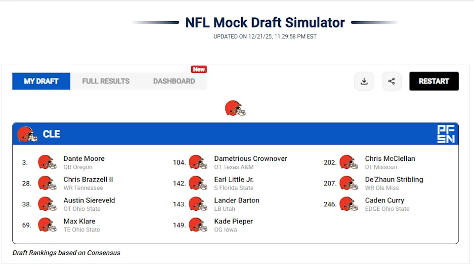 Draf tiruan Browns 2026 minggu ini diselesaikan dengan bantuan Simulator Draf Tiruan Jaringan Sepak Bola Pro dan memiliki gelandang berbeda untuk Cleveland di babak pertama: