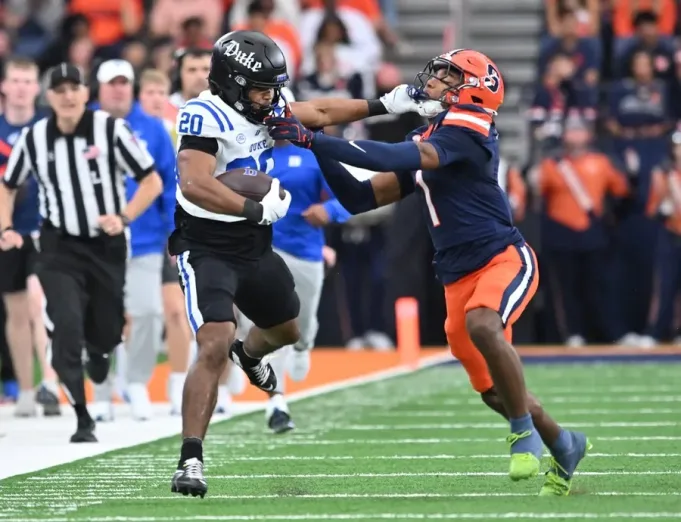 NCAA Football: Duke at Syracuse27 Sep 2025; Syracuse, New York, AS; Duke Blue Devils berlari kembali Nate Sheppard (20) mencoba menahan tekel oleh bek belakang Syracuse Orange Demetres Samuel Jr (1) pada kuartal kedua di JMA Wireless Dome. Kredit Wajib: Mark Konezny-Imagn Images
