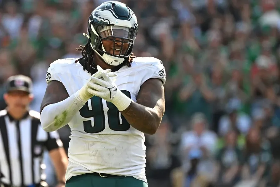 21 September 2025; Philadelphia, Pennsylvania, AS; Pertahanan Philadelphia Eagles mengatasi Jalen Carter (98) menentang Los Angeles Rams di Lincoln Financial Field. Kredit Wajib: Eric Hartline-Imign Images