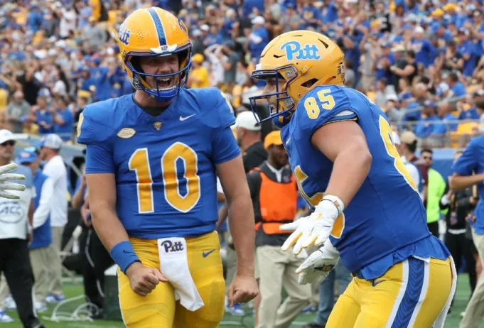 6 Sep 2025; Pittsburgh, Pennsylvania, AS; Quarterback Pittsburgh Panthers Eli Holstein (10) dan Josh Altsman (85) yang ketat merayakan setelah menggabungkan touchdown melawan Central Michigan Chippewas selama kuartal kedua di Stadion Acrisure. Kredit Wajib: Gambar Charles Leclaire-Imagn