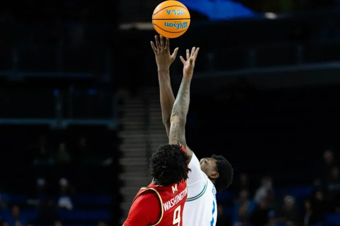 Center UCLA Xavier Booker (1) memberi tip selama pertandingan bola basket 10 Besar melawan Maryland, Sabtu, 10 Januari 2025 di Los Angeles, California