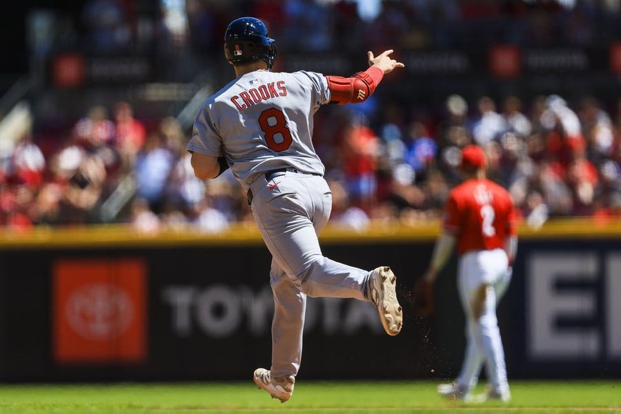 Scoundrels mendapat hit liga besar pertamanya pada hari Minggu, seorang homer, ketika Cardinals jatuh 7 – 4 di Cincinnati untuk tetap 5 1/ 2 pertandingan dari port Wild-Card Liga Nasional kedua. Crooks membuat debut liga utamanya Jumat sebagai pengganti defensif.