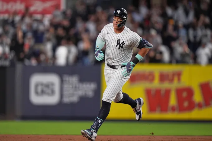 Dengan ledakan inning pertama 412 kaki ke lapangan kanan-tengah, Hakim Aaron melewati Yogi Berra di papan peringkat home run sepanjang masa New York Yankees Selasa melawan Detroit Tigers.