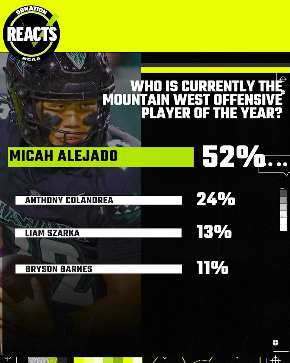 Ada banyak titik terang di Mountain West musim ini, tapi tidak ada yang lebih terang dari gelandang Hawaii Micah Alejado. Dia telah mengubah serangan Hawaii menjadi serangan raksasa yang ofensif, dan lebih dari separuh pemilih percaya dia harus dinobatkan sebagai Pemain Ofensif MW Tahun Ini untuk tahun 2025.