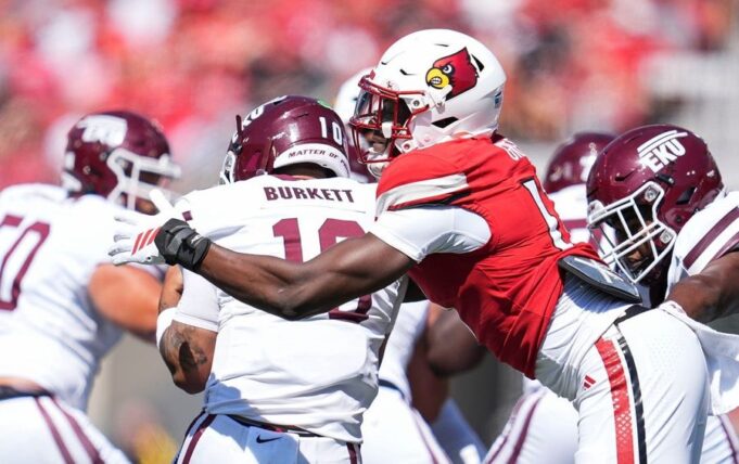 Sindikasi: The Courier-Journal Gelandang bertahan Louisville Cardinals AJ Green (17 memecat quarterback Kolonel Kentucky Timur Myles Burkett (10 selama babak pertama melawan EKU di pembuka musim Cardinals, Sabtu, 30 Agustus 2025 di L&N Federal Lending institution Stadion di Louisville, Kentucky.