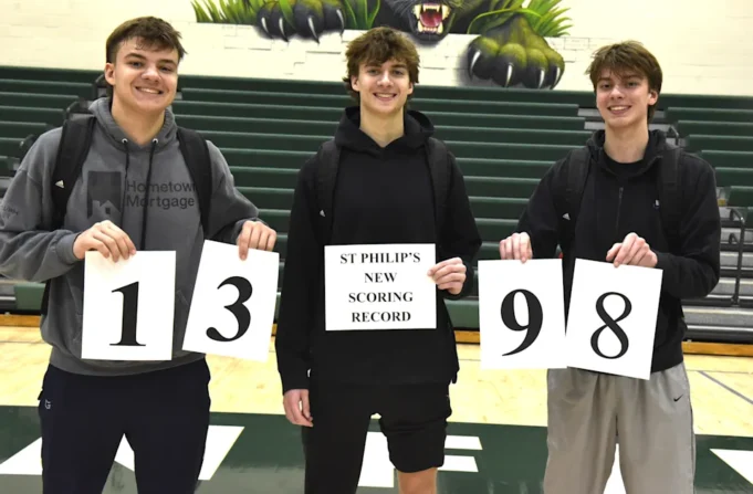 Elderly St. Philip Jackson Dzwik, tengah, merayakan pemecahan rekor pencetak gol karir sekolah bersama saudara-saudaranya Carter Dzwik, kiri, dan Lincoln Dzwik, kanan. Jackson memecahkan rekor lama 1 398 poin karir yang dibuat oleh Conor Gausselin pada tahun 2020 dengan mendapatkan 12 poin saat kalah dari Pennfield pada hari Sabtu.