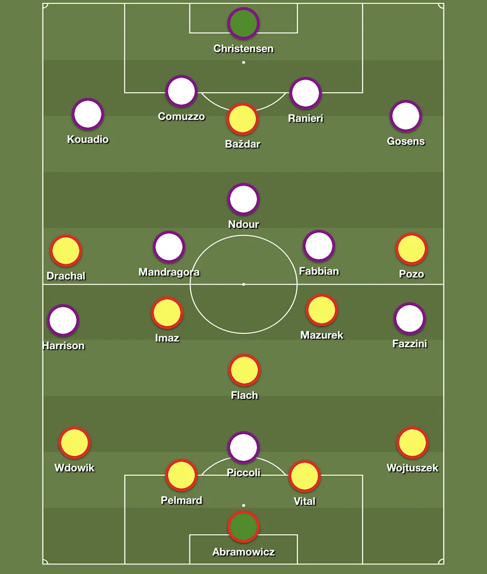 Jagiellonia Białytok (4 – 3 – 3: Abramowicz; Wdowik, Pelmard, Essential, Wojtusek; Imaz, Romanczuk, Flach; Drachal, Pululu, Pozo|||Fiorentina (4 – 3 – 3: Christensen; Gosens, Ranieri, Comuzzo, Kouadio; Fabbian, Ndour, Mandragora; Fazzini, Piccoli, Harrison