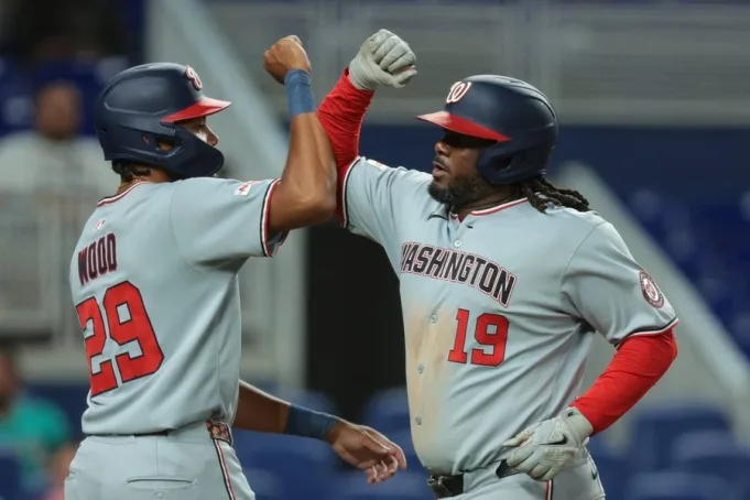 MLB: Washington Nationals di Miami Marlins 8 Sep 2025; Miami, Florida, AS; Baseman pertama Washington Nationals Josh Bell (19 merayakannya dengan pemain sayap kiri James Timber (29 setelah melakukan run home-run melawan Miami Marlins selama inning keenam di Loandepot Park. Kredit Wajib: Gambar Sam Navarro-Imagn