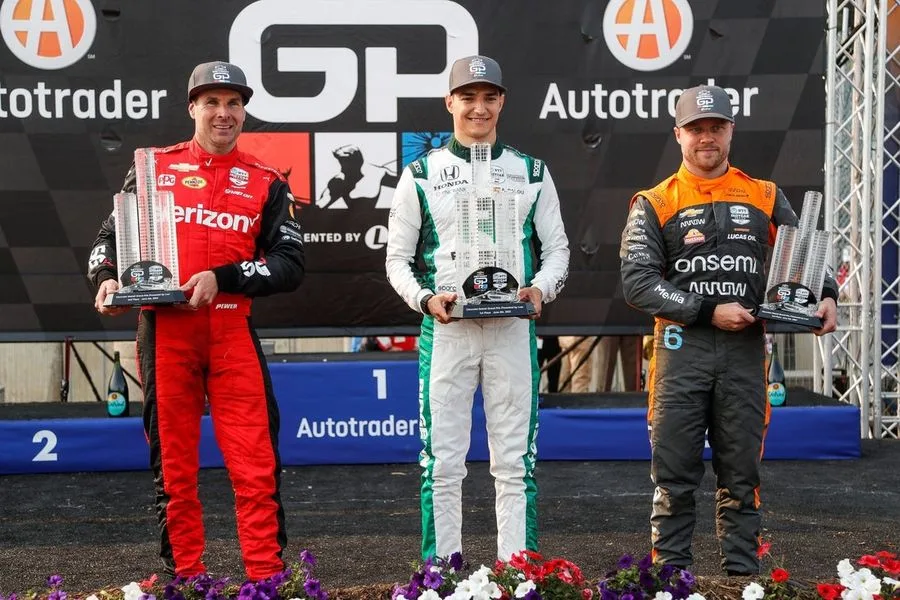 Sindikasi: Detroit Free Press Pemenang Grand Prix Detroit Alex Palou, tengah, tempat kedua akan berkuasa, kiri, dan tempat ketiga Felix Rosenqvist merayakan dengan trofi mereka di Detroit pada hari Minggu, 4 Juni 2023