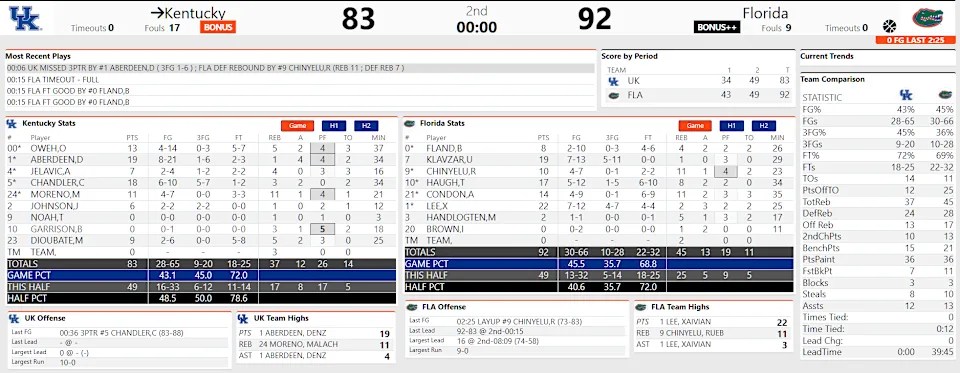 Denzel Aberdeen menyelesaikan dengan 19 poin tertinggi tim (tembakan 8/21) saat kembali ke Florida, sementara Collin Chandler melanjutkan permainan panasnya dengan 18 poin (tembakan 6/10). Malachi Moreno mencetak double-double dengan 11 poin dan 11 papan karena sahamnya terus meningkat, meski bermain melawan lini depan Florida yang sangat kuat.